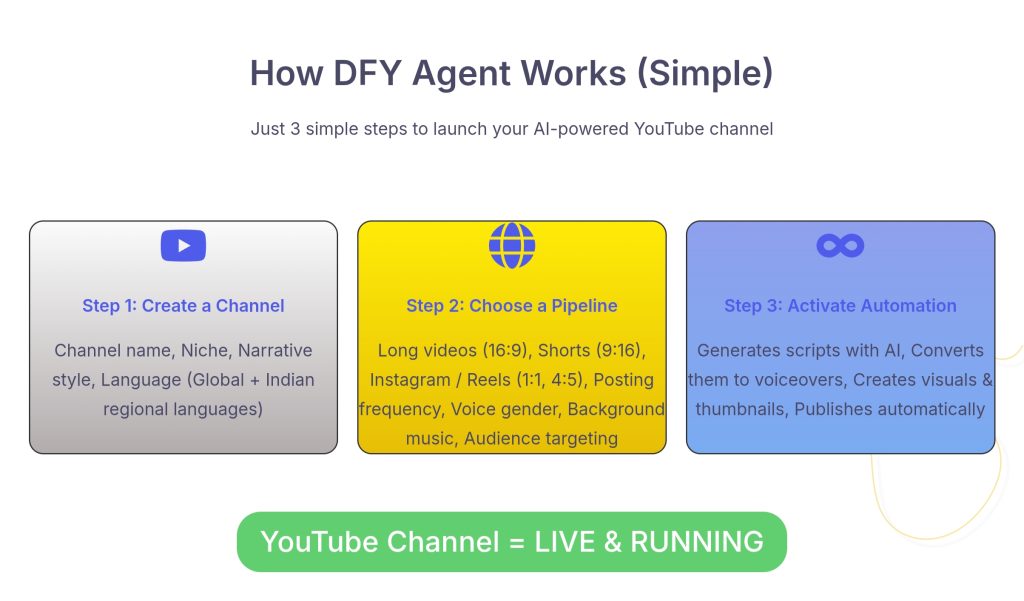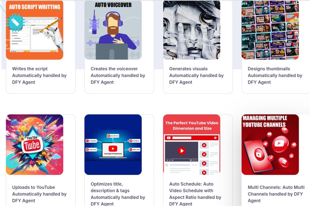 DFY Agent is a next generation No-Code Youtube Automation AI that builds, manages and scales Youtube Channels in full Autopilot mode - without recording videos , editing footage or writing code.